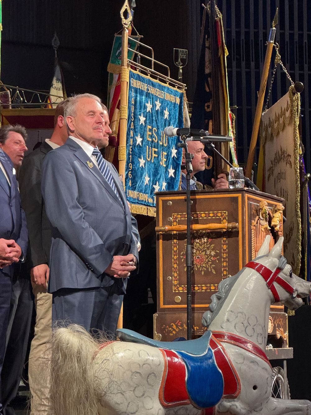 Die Laudatio auf den Innenminister hielt Rainer Schmeltzer (SPD), Vizepräsident des Landtags Nordrhein-Westfalen und langjähriger politischer Ansprechpartner der Schaustellerbranche. Schmeltzer engagiert sich seit vielen Jahren als Schirmherr und Unterstützer der Arbeitsgemeinschaft der Schaustellerverbände in Nordrhein-Westfalen und wurde im vergangenen Jahr selbst mit dem „Goldenen Karussellpferd“ der Schausteller ausgezeichnet. In seiner Rede würdigte Schmeltzer insbesondere den Einsatz Reuls für die Belange der Schaustellerinnen und Schausteller sowie für die Sicherheit großer Volksfeste im Land.